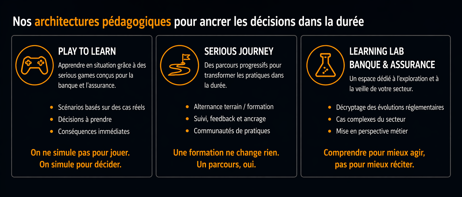 Nous accompagnons les acteurs de la banque et de l’assurance dans la montée en compétences de leurs équipes, avec des dispositifs pédagogiques concrets, engageants et directement opérationnels.